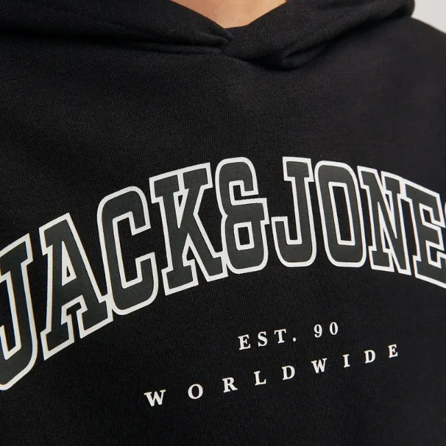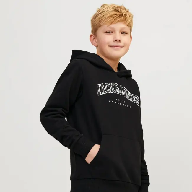 JACK & JONES JUNIOR Duks za dečake sa kapuljačom JJCALEBB u crnoj boji, klasik je za školske dane.